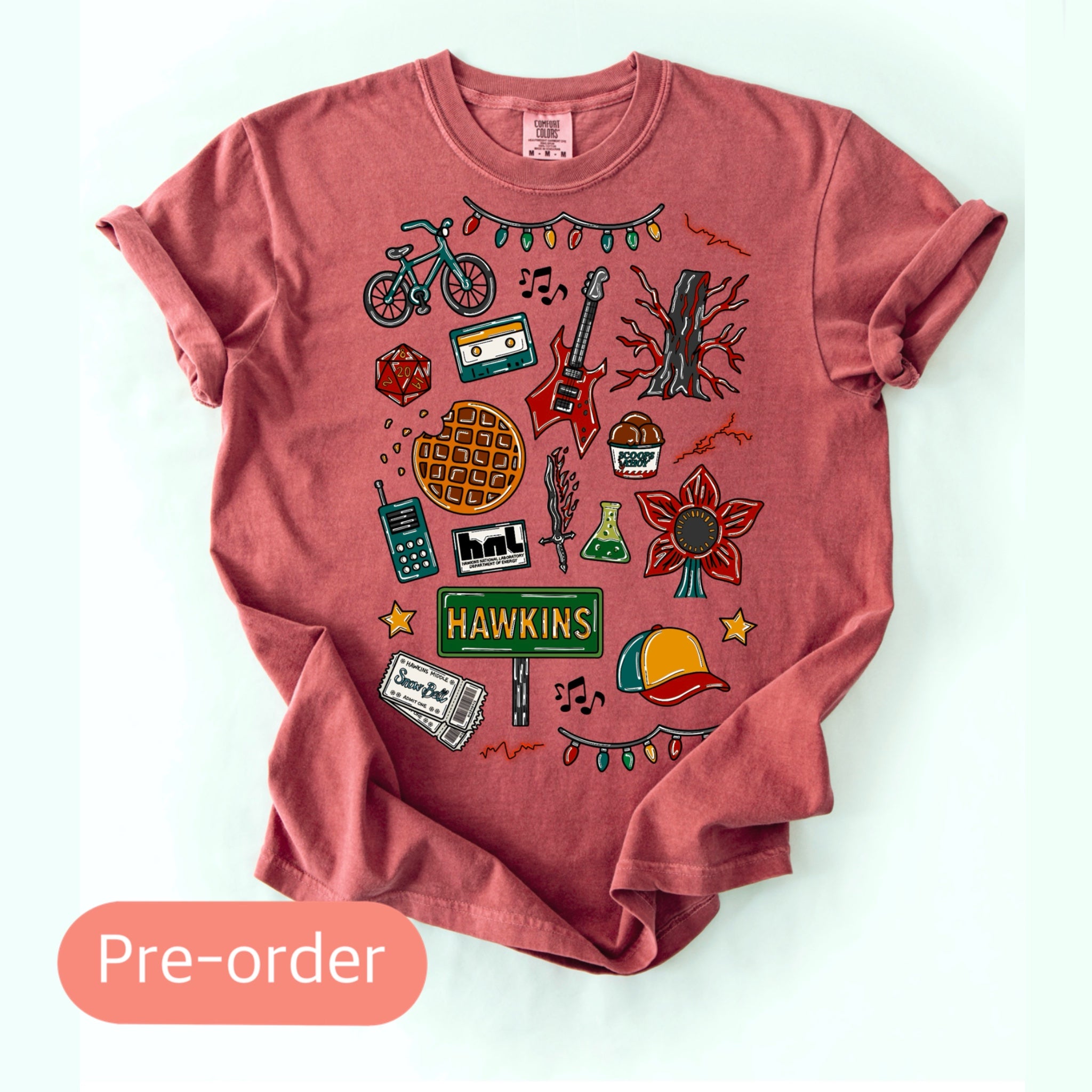 Step into the mysterious world of Hawkins with this Stranger Things-inspired tee that celebrates all the supernatural thrills and nostalgic '80s charm. Whether you're Team Demogorgon or just obsessed with the show's mind-bending plot twists, this tee lets your fandom shine in the coolest way possible.